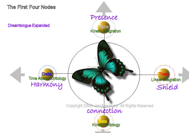 Node 4 (fourth position) begins in the "BACK" or behind orientation of the EM field. This position refers to the DELTA level of Dreamtongue. The Delta Node is where experience and Self are integrated into groups and collections, and even gestalts. The Delta Node is somewhat of a memory bank, and so, is the "wizard behind the curtain" within your psyche. I realize that is an odd analogy to throw out right now, but think about it. Apart from it's core functions the Delta Node directs the relationships you have in your life. Relationships with family, friends, lovers, peers, co-workers, neighbors, strangers, and society as a whole. It is where you fit in socially and interpersonally in your own life. As you might suspect, this is a node of special interest to us all, as for the most part it remains a mystery to many.