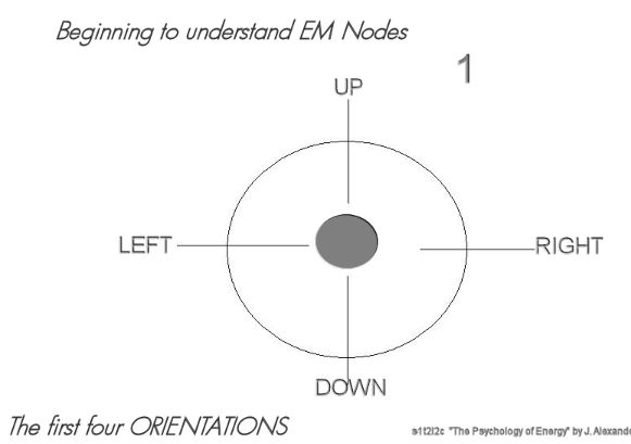 Now that you have an idea of the four orientations, you are ready to learn about the actual Nodes. Nodes occur within the EM field any time a particular "area of thought" dominates a person (a person's mind). There are four fundamental "areas of thought" which originate from deep within your being, your mind/body, your central nervous system, and essentially, your genetics.. These "areas of thought" or matrices shape how you and everyone else thinks, feels, and behaves. When one of these matrices are active/dominant in a person's EM field it becomes a "NODE." On the creative side, I like to call these Nodes "innergies," but will stick to Nodes for the sake of the lessons.